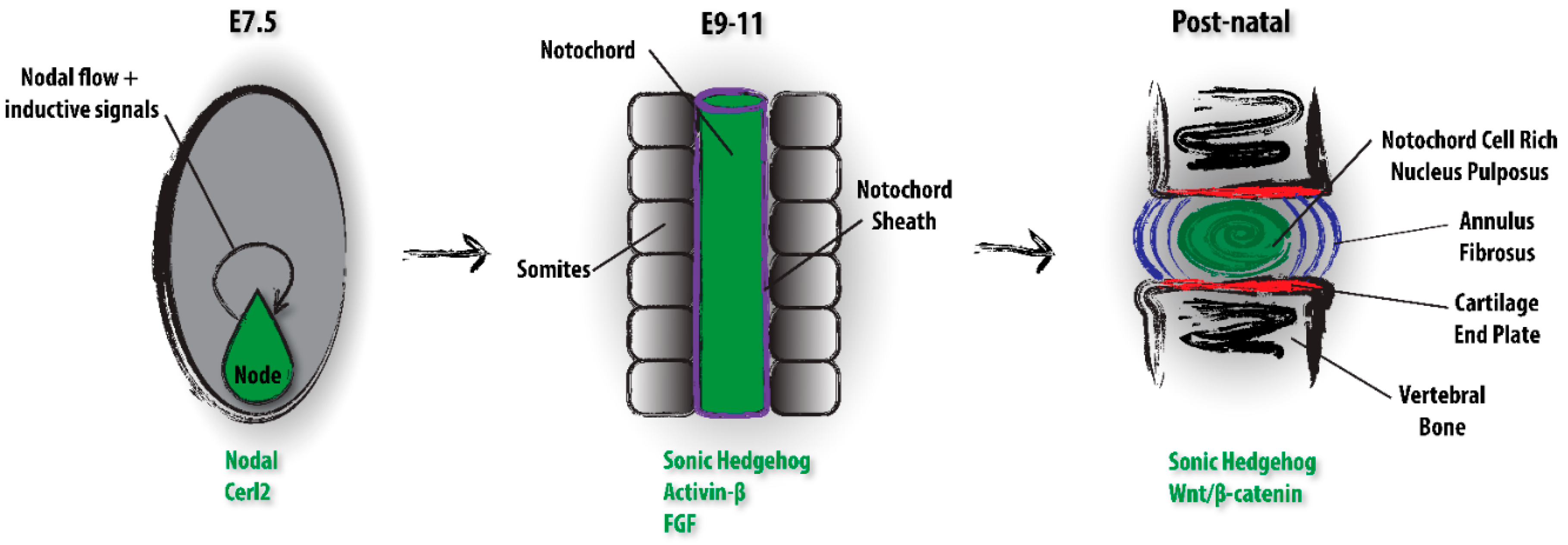 Much of our knowledge of mammalian notochord development is derived from experiments using mouse models due to their short gestation period, large litter sizes and ease of genetic manipulation. As such, the data presented below apply to the murine model and developmental stages, unless otherwise indicated.