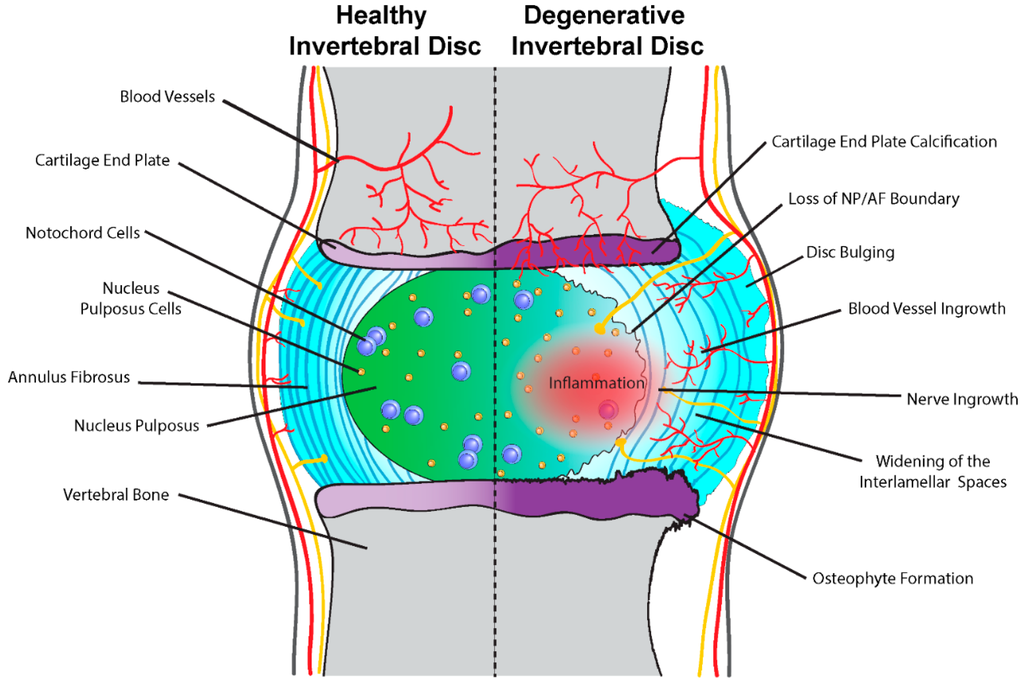 Schematic representation highlighting the hallmarks of human disc degeneration. Compared to healthy intervertebral disc, the degenerative disc has increased inflammation, blood vessel and neuronal ingrowth, loss of the boundary between the NP and annulus fibrosus (AF), and widening of the interlamellar space between collagen bundles in the AF that often results in disc bulging. In advanced degeneration the cartilage endplate calcifies and osteophytes form on the adjacent vertebral bones.