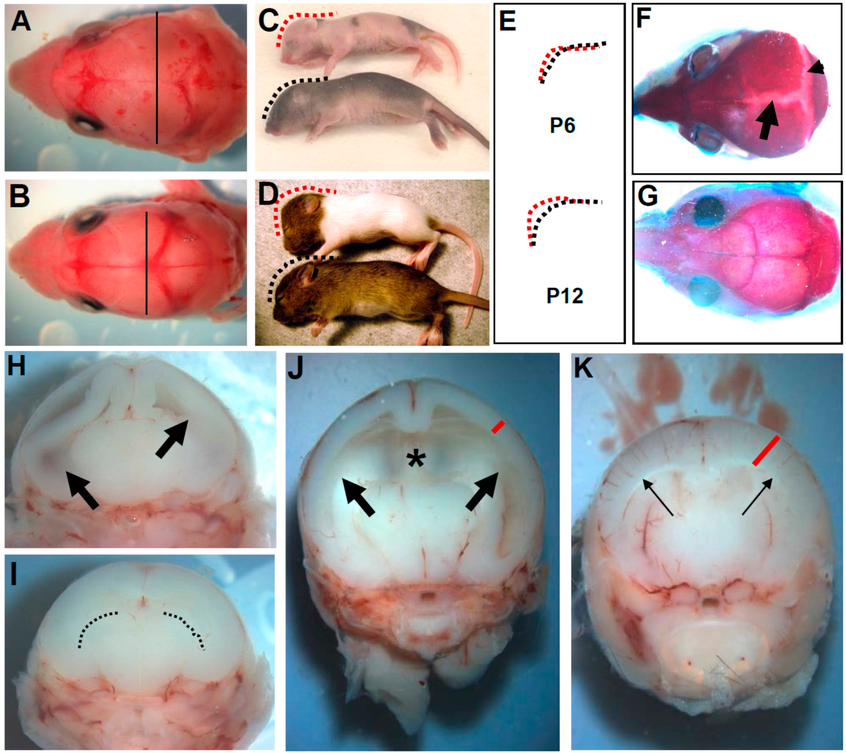 Pax3flox/flox/Wnt1-Cre conditional knockout mice exhibit congenital hydrocephalus, indicating that restricted loss of Pax3 within both the neural tube and migratory neural crest is sufficient to cause defects. (A,B) Dorsal view of postnatal (P) day 1 heads in Pax3flox/flox/Wnt1-Cre (A) and control (B) littermates. Lines drawn at similar anatomical planes measure the width of the heads, showing mild enlargement in mutants (A); (C,D) Lateral view of P6 (C) and P12 (D) Pax3flox/flox/Wnt1-Cre (top) and control (bottom) littermates. Note the generalized pigmentation defect in mutants; (E) Dashed lines from C,D illustrate the domed (red) mutant cranium; (F,G) Dorsal view of skeletal preparation of P20 Pax3flox/flox/Wnt1-Cre (F) and control (G) heads; Note sagittal (arrowhead) and transverse (arrow) suture fusion defects in only the mutants (F); (H,I) Transverse views of P1 heads from animals in (A,B); significant dilation of lateral ventricle (arrows) is already present in Pax3flox/flox/Wnt1-Cre mutants (H); dashed lines in control (I) indicate normal lateral ventricles; (J,K) Transverse view of P6 heads. Further dilation of lateral ventricles (large arrows) and loss of interventricular tissue (asterisk) is present in Pax3flox/flox/Wnt1-Cre mutants (J). As a consequence of expansion of mutant lateral ventricle, a thinned cortex (red line) also results.