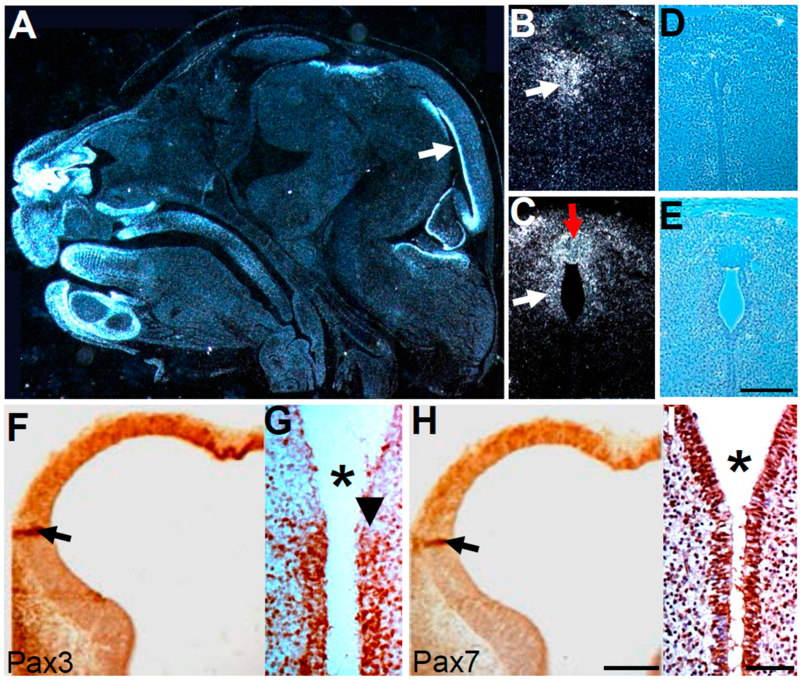 Analysis of Pax3 and Pax7 spatiotemporal expression patterns, Cre expression limits and cell proliferation during cerebral ventricular development. (A–C) In situ hybridization detection of Pax3 mRNA in E15.5 wild-type heads show active expression in ventricular epithelium (arrow) and multiple craniofacial structures (A). Coronal E14.5 sections cut at the subcommissural organ (SCO, indicated by the red arrow in C) level of Pax3flox/flox/Wnt1-Cre mutant (B) and control (C) reveal Pax3 is still expressed in the ventricular epithelium (white arrow) comparable to control (C), despite collapse of the ventricular opening in mutants; (D,E) Phase contrast images of B,C, illustrating the lack of a distinct subcommissural organ in the mutant D); (F,H) Immunohistochemical detection of Pax3 (F) and Pax7 (H) protein on adjacent telencephalic vesicle sections at E10, reveals co-localization in the majority of the neuroepithelium, with especially robust expression (brown) in the lamina terminalis. The black arrows point to intense artificial staining due to tissue folding; (G,I) Immunohistochemical detection beta-galactosidase expression following lineage mapping at E13.5 for Pax7−Cre/R26r (G) and Wnt1-Cre/R26r (I) following Cre-mediated activation of R26r reporter. While Wnt1-Cre marks the ependymal layer from third ventricle (3v) through aqueduct (I), Pax7−Cre only marks the ependymal layer of 3v (arrow points to the 3v-aqueduct junction and asterisk indicates aqueduct). Scale bars: B–E = 100 µm; F,H = 200 µm; G,I = 50 µm.