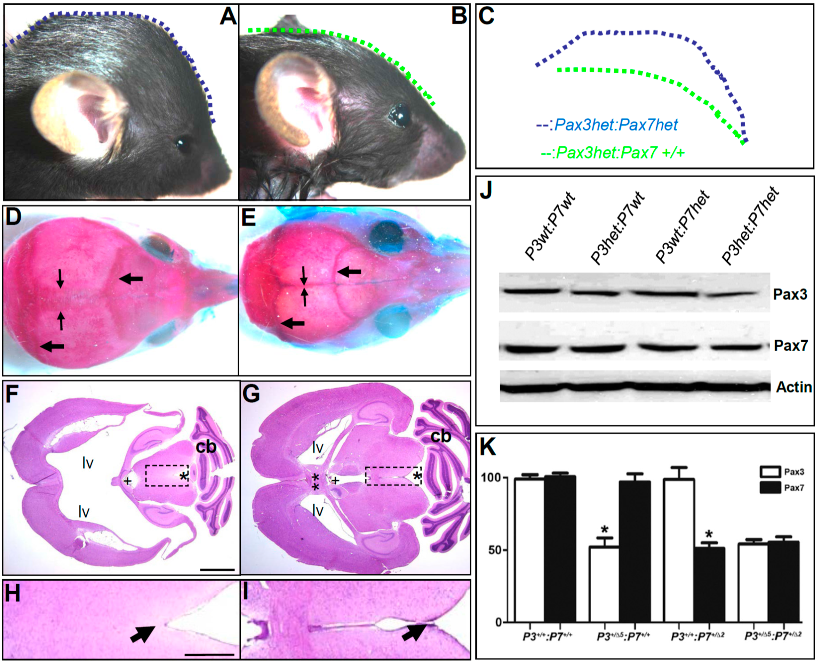 Pax3 and Pax7 play a combinatorial role in cerebral ventricular development. (A–C) Lateral views of Pax3+/Δ5/Pax7+/Δ2 compound heterozygous mutant (A) and control (B) P20 littermates, with lateral profiles depicted by dotted lines and compared side-by-side to highlight the large domed cranium in Pax3+/−/Pax7+/− mutant (C); (D,E) Skeletal preps of heads from animals in (A,B); only the compound mutant (D) displays sagittal (narrow arrows) and transverse (thick arrows) suture fusion defects; (F,G) Hematoxylin and eosin sections reveal that the mutant lateral ventricle (F) is dilated and there is a loss of structure, when compared to control (double asterisks, G). The normal anterior segment of the third ventricle (plus sign), aqueduct (asterisk), and cerebellum (c,b) are indicated; (H,I) high power view of stenotic connection between mutant third ventricle and aqueduct (arrow, H), compared to normal third ventricle-aqueduct junction in control (I); (J,K) Results of representative Western blot analysis (J) and densitometric quantification (K) of Pax3 and Pax7 expression levels in individual E10.5 whole embryo lysates of designated genotypes (n = 3–5 of each genotype were analyzed). Note the gene dosage-dependent reduction (~50%) of corresponding protein level in various heterozygous compound offspring, relative to wild-type (P3+/+/P7+/+). Data are represented as mean ± SEM, * p < 0.05 by Student’s t-test (Pax3 versus Pax7 in each genotype). Scale bars: F,G = 2 mm; H,I = 0.5 mm.