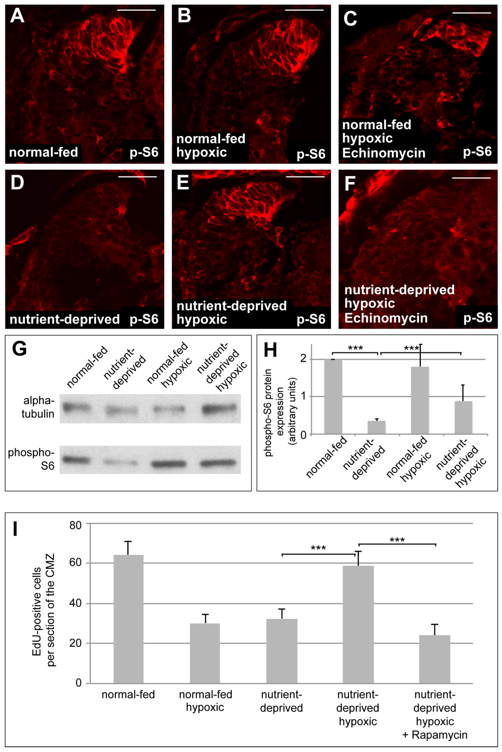 Reactivation of mTOR signalling, mediated by HIF-1 function, is required when nutrient-deprived retinas increase proliferation in hypoxia. (A–D) Immunostaining for the mTOR target phospho-S6 (p-S6) in retinas from normal-fed (A–C) or nutrient-deprived (C–E) animals kept in normal oxygen concentration (A,D), under hypoxia (B,E) or under hypoxia and treated with Echinomycin (C,F). Incubation of nutrient-deprived retinas in hypoxia restores p-S6 staining in the CMZ. Echinomycin treatment interferes with the increase of p-S6 staining in the CMZ of nutrient-deprived hypoxic retinas. Scale bars = 50 µm; n = 3. In each condition, a minimum of 8 retinas was examined. (G) Western blot of retinas dissected from normal-fed or nutrient-deprived normoxic or hypoxic animals, probed for phospho-S6 and α-tubulin. At least 22 retinas were taken for each condition, and all conditions in each experiment have the same number of retinas (n = 10). (H) Quantification of the Western blot shown in (G). Phospho-S6 levels, normalized to tubulin, are significantly reduced upon nutrient deprivation, unaffected by hypoxia alone, and increase to 40% of control levels upon nutrient deprivation in hypoxia. In Western blot quantification, error bars represent standard deviations between 10 independent experiments. Two hooked ends of horizontal lines indicate the two conditions compared, *** p-values < 0.001; n = 10. (I) Quantification of EdU incorporation in retinas from normal-fed or nutrient-deprived animals kept in normoxia, hypoxia or incubated with Rapamycin under hypoxia. Nutrient-deprived retinas no longer resume their proliferation in hypoxia when mTOR signalling is blocked by Rapamycin. Error bars represent standard deviations between two independent experiments. Two hooked ends of horizontal lines indicate the two conditions compared, *** p-values < 0.001; n = 2. For each condition, between 7 and 15 retinas were quantified.