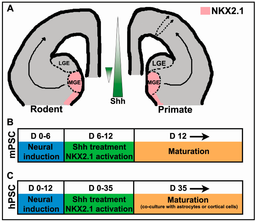 Sonic hedgehog (Shh)-dependent in vivo and in vitro cortical interneuron progenitor specification and maturation. (A) Schematic illustration of interneuron fate specification in vivo in the rodent and primate model. Shh signaling is highest in the developing ventral forebrain in contrast to a reversal in this gradient within the medial ganglionic eminence (MGE). Black solid arrows represent established tangential migrations of inhibitory progenitors derived from the MGE and dashed arrows indicate a proposed dorsal niche generating a subset of GABAergic progenitors that move radially to the neocortex. The shaded pink area represents NKX2.1 expression within the ventral telencephalon; (B,C) mouse (mPSC) and human pluripotent stem cells (hPSC) differentiation timelines (in days (D)) for deriving GABAergic interneurons in vitro.