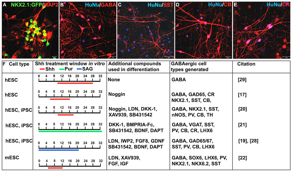 Comparison of protocols used to generate gamma-aminobutyric acid-containing GABAergic inhibitory interneurons from a PSC source. (A–E) NKX2.1-positive progenitors give rise to various interneuron subtypes in a co-culture system with mouse cortical astrocytes. Significant NKX2.1:GFP, MAP2, and calretinin (CR) protein expression observed after 10 weeks of co-culture and robust calbindin (CB), neuropeptide somatostatin (SST), and gamma-aminobutyric acid (GABA) expression seen after 17 weeks in vitro; (F) comparison of published protocols for the in vitro generation of GABAergic interneurons showing the time window of Sonic hedgehog (Shh) and Smoothened (Smo) agonist treatment, as well as additional exogenous compounds used in promoting neural differentiation. Scale bars: A = 10 μM, B–E = 20 μM. hESC = human embryonic stem cells, iPSC = induced pluripotent stem cells, mESC = mouse embryonic stem cells, Pur = purmorphamine.