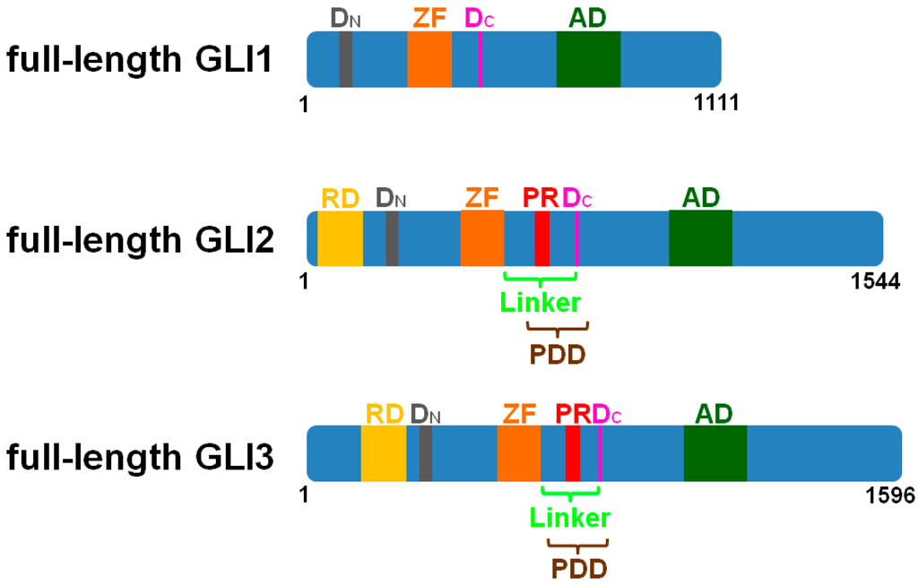 - Wang, B.; Fallon, J.; Beachy, P. Hedgehog-regulated processing of Gli3 produces an anterior/posterior repressor gradient in the developing vertebrate limb. Cell 2000, 100, 423–434. [Google Scholar] [CrossRef]
