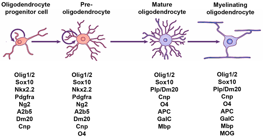 Oligodendrocytes (OLs) are the myelinating cells of the central nervous system (CNS). These cells are consistently found in vertebrates in which they appeared relatively late in evolution in hinge-jawed fishes [1,2]. Contrasting with the wide distribution of OLs in the mature CNS, OL progenitor cells (OPCs) originate at early stages of development in restricted sites bordering the cerebral ventricles and spinal canal before they subsequently migrate into adjacent regions. OPCs express a characteristic set of markers, including the platelet-derived growth factor receptor alpha (Pdgfrα) and the neuron/glial antigen 2 (NG2) proteoglycan. Both markers are rapidly downregulated when the cells differentiate into OLs, unlike other lineage markers as the transcription factors SRY-Box (Sox) 10 and Olig2, which are expressed in both OPCs and OLs. The mature OLs can be identified by their expression of adenomatous polyposis coli (APC) and the myelin basic protein (Mbp), among others (Figure 1). Like neurons and astrocytes, OLs derive from radial glial cells (RGCs), themselves the progeny of the neuroepithelial cells constituting the primitive neuroepithelium [3]. At early stages of neurogenesis, the potential of these primary progenitors becomes regionally restricted through the activity of organizing signals. The latter involve gradients of secreted proteins such as Hedgehog and BMP/Wnt proteins, which emanate from the ventral or dorsal regions of the developing CNS, respectively. The different signals provide positional information to nearby progenitors by upregulating specific sets of transcription factors which will then control cell fate decisions [4].