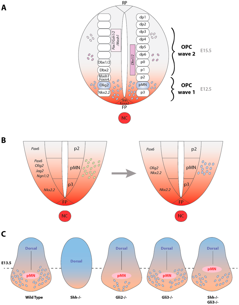 Hedgehog-dependent production of the OL lineage in the developing spinal cord. (A) Cross-sectional view of the neural tube indicating the production of the secreted Hedgehog proteins (red) from the notochord (NC) and the floorplate (FP). The roofplate (RF) secretes BMP and Wnt. Oligodendrocyte progenitor cells (OPCs) are produced as successive waves, which occur in mice at E12.5 and E15.5, respectively. The first wave arises from the pMN domain and the second one from progenitors expressing either Pax7/Gsh1/2/Mash1 or Dbx1/2. The ventral (p0–p3, pMN) and dorsal (dp1–6) neuroepithelial domains are indicated on the right side of the neural tube while the gene expression patterns for the different ventral progenitor domains are indicated on the left side; (B) Schemes of the ventral neural tube during Hedgehog-dependent MN (left, in green) and OL (right, in blue) generation from the pMN domain. At the time of OPC specification, Hedgehog signaling maintains Olig2 expression in the pMN domain whereas it promotes the dorsal extension and regression of the Nkx2.2 and Pax6 domains, respectively; (C) Schematized views of the neural tube in E13.5 wild-type or knockout mice indicating the distribution of OPCs derived from the pMN. OPCs (blue) have already invaded the ventral neural tube in the wild-type mouse. In the absence of Shh, no ventralization of the neural tube is observed and OPCs are completely absent. In the Gli2 mutant, the ventral production of OPCs is highly decreased while it is unaffected in the Gli3 mutant. Finally, the Gli3 mutation partially rescues the ventral oligodendrogenesis in the Shh mutant.