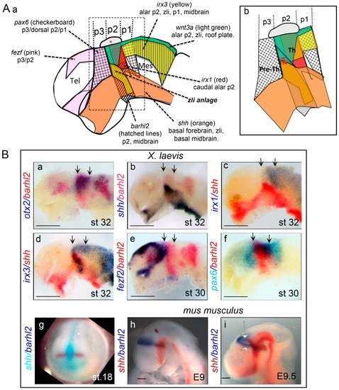Schematic of Xenopus (X.) laevis forebrain markers and flat-mounted neural tubes from X. laevis and Mus musculus embryo after whole-mount double in situ-hybridization (WM-dISH). (A) Schematic of X. laevis forebrain markers at st. 30. (a) Areas of expression are shown and indicated for fezf2 (pink), pax6 (checkerboard pattern), irx3 (yellow), wnt3a (light green), shh (orange), barhl2 (hatched lines), and irx1 (red). (b) Enlargement of the diencephalic part indicated by a rectangle in (a). The pineal gland located on top of p2 is marked by an asterisk. The future zli is indicated in (b). p: prosomere; Tel: telencephalon; Mes: mesencephalon; Pre-Th: pre-thalamus; zli: zona limitans intrathalamica; Th: thalamus. (B) WM-dISH is performed using otx2, irx1, irx3, fezf2, pax6, and shh or barhl2 as probes on (a–g). X. laevis and mouse embryos at different developmental stages as indicated. Neural tubes (a–f) or heads (h,i) of representative embryos, dissected and flat-mounted, are shown from a side view, dorsal up, anterior left except for (g), shown in anterior view, dorsal side up. The markers and stages are indicated. Black arrows indicate the rostral and caudal boundaries of p2. White arrows indicate the bilateral zli. Scale bar: 0.5 mm.
