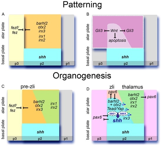 In conclusion, while Wnt-mediated signals are important for maintenance of the zli anlage, and to generate the permissive conditions for the activation of Shh in the zli, they must act in collaboration with a combination of factors at the prethalamic (Fezf/Fez) and thalamic (Barhl2, Irx3, and Otx2) forebrain borders.
