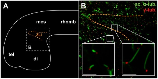 - Willaredt, M.A.; Tasouri, E.; Tucker, K.L. Primary cilia and forebrain development. Mech. Dev. 2013, 130, 373–380. [Google Scholar] [CrossRef] [PubMed]