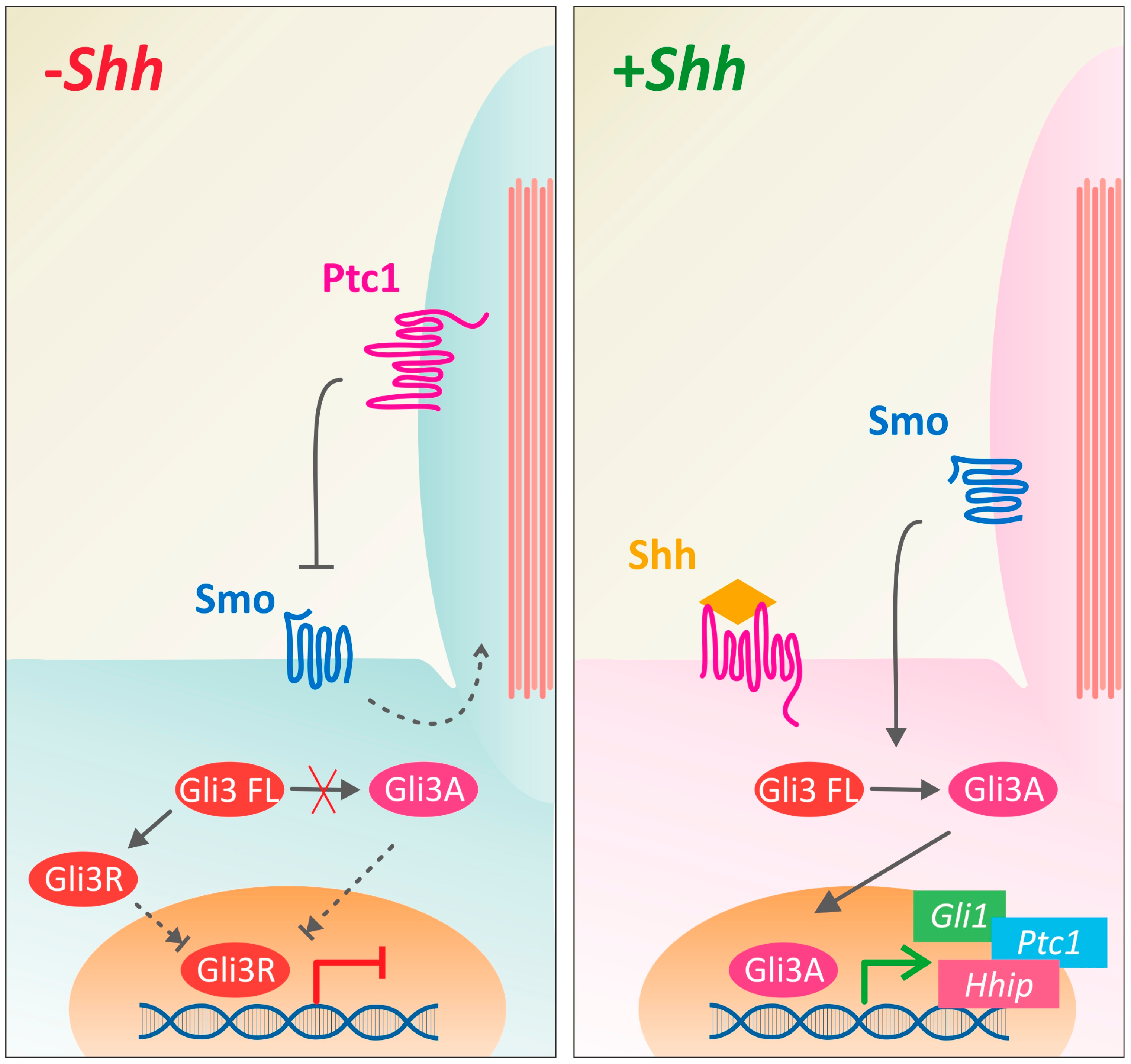 Canonical Shh signaling requires translocation of Smo into the primary cilium. Canonical Shh signaling depends on the de-repression of the G-protein-coupled receptor-like molecule Smoothend (Smo) by a mechanism involving the multiple-pass transmembrane receptor Patched1 (Ptc1). In the absence of Shh, Ptc1 represses Smo activity by preventing its translocation to the cilium. Shh binding to Ptc1 relieves this repression, allowing Smo to translocate to the primary cilium, where it activates intracellular signaling pathways. This activation of Smo culminates in transcriptional activity, via its regulation of Gli transcription factors that can activate or repress Shh target genes. Gli1 is always an activator of gene expression, whereas Gli2 and Gli3 (Gli3FL) need to be processed from a repressor (Gli3R) to an activator form (Gli3A) in a Smo-dependent manner.