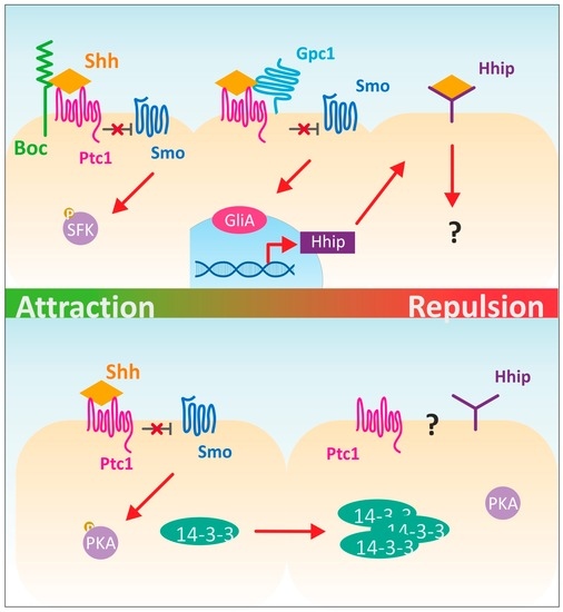 The role of Shh in axon guidance was identified much later than its function in cell differentiation and tissue patterning [12]. Initially, Shh was shown to inhibit the axon growth of retinal ganglion cells [13]. Later, Shh was implicated in commissural axon guidance in the spinal cord [14,15,16,17,18]. This role was extended to other populations of neurons [19,20,21,22,23].