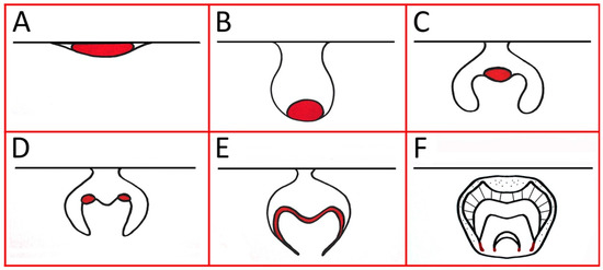 Schematic representation of Shh transcription in the developing tooth (red). (A) Initiation; (B) Early bud stage (at the tip of the bud in enamel knot precursor cells); (C) Early cap stage (in the primary enamel knot); (D) Late cap stage (in the secondary enamel knots); (E) Bell stage (in the internal enamel epithelium, pre-ameloblasts and stratum intermedium); (F) During root development (in Hertwig’s epithelial root sheath).