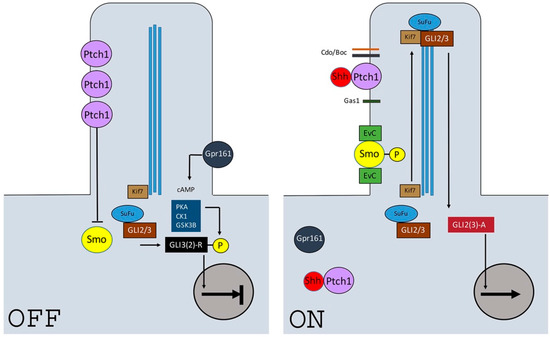 A simple diagrammatic representation of the (known) key events in Shh signaling at the primary cilium. In the absence of signal (OFF), Ptch1 accumulates at the ciliary membrane and represses Smo. GLI proteins are sequestered by Kif7 and Suppressor-of-fused (SuFu), and phosphorylated through the activity of Gpr161, PKA, CK1 and GSK3B. The phosphorylated GLI proteins are proteolytically processed into truncated repressor forms, which act to inhibit transcriptional activation of the pathway. The signaling pathway is activated (ON) through the binding of Shh to Ptch1, which is facilitated by Cdo, Boc and Gas1 co-receptors. The receptor complex is internalized and degraded, which leads to the accumulation of Smo in the ciliary membrane, where it is phosphorylated and interacts with Ellis-van Creveld (EvC) proteins in the basal component of the cilium. The Kif7, SuFu, and GLI complex moves to the tip of the cilium where GLI is concentrated and then transported back to the cytosol where it enters the nucleus as a full length activator of transcriptional targets.