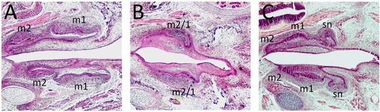- Viriot, L.; Lesot, H.; Vonesch, J.L.; Ruch, J.V.; Peterka, M.; Peterkova, R. The presence of rudimentary odontogenic structures in the mouse embryonic mandible requires reinterpretation of developmental control of first lower molar histomorphogenesis. Int. J. Dev. Biol. 2000, 44, 233–240. [Google Scholar] [PubMed]