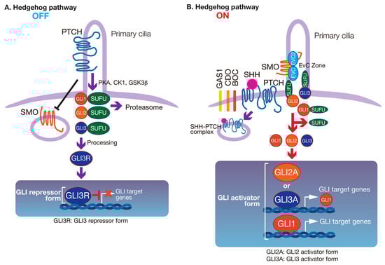 The Hedgehog signaling pathway. (A) In the absence of Hedgehog (HH) ligand, Patched (PTCH) blocks the ciliary localization of Smoothened (SMO), and a repressor form of GLI (mainly GLI3R) suppresses the induction of GLI target genes. (B) Signaling is activated in the presence of HH ligand. The binding of HH ligand to PTCH prevents PTCH inhibition of SMO, and SMO then interacts with the Ellis van Creveld Syndrome (EVC)–EVC2 complex and translocates into primary cilia to be fully activated. SMO then activates GLI family transcription factors, mainly GLI2. GLI2 up-regulates the expression of GLI1, as well as GLI target genes. GLI1 is also activated downstream of SMO. Activated GLI2 (GLI2A) and GLI1 further upregulate the expression of various GLI target genes. This figure has been adapted from our previous work [].
