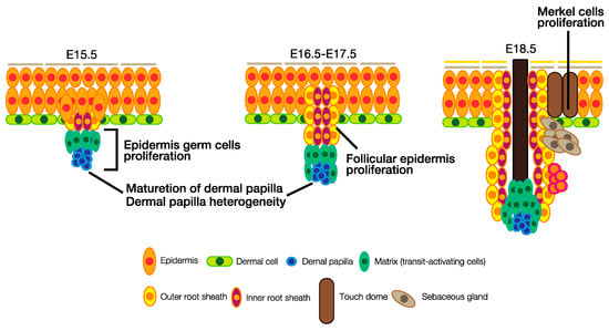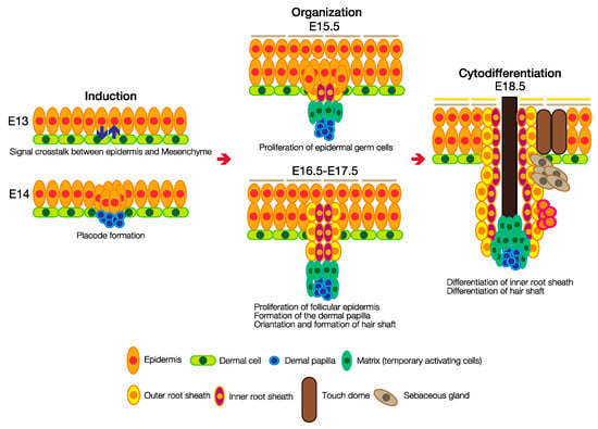 The development of hair follicles is intrinsically related to the stratification of the embryonic epidermis. Hair follicle development is the result of epithelial–mesenchymal interactions. Although hair follicle development occurs in eight morphologically distinct stages, it can more simply be divided into three phases: induction, organogenesis and cytodifferentiation []. In the induction phase, which is the initiation of hair follicle development (E13), signaling crosstalk between the epidermis and dermis is induced, and epidermal keratinocytes form clusters that become enlarged and elongated to form hair placodes (E14). Hair follicle development then enters the organogenesis phase. A cluster of specialized fibroblasts, the precursors of the dermal papilla, is formed just under the placode, and the signaling crosstalk between these specialized fibroblasts and the epithelial placode leads to cell proliferation in both structures. The enhanced cell proliferation leads to a downward growth of the epidermal component, shaping the dermal papilla. The resulting structure, called the hair germ, is typically observed at E15.5. Keratinocyte downgrowth continues, whereby the most proximally located keratinocytes begin to wrap around the dermal papilla (E16.5–E17.5). As follicles enter the cytodifferentiation phase, the inner root sheath is formed, triggering the terminal differentiation of keratinocytes above the dermal papilla to generate the hair shaft. Simultaneously, the outer root sheath starts to form a cylinder around the inner root sheath to create a bulbous peg structure (E18.5). Additional appendages such as sebaceous glands and touch domes also develop during this phase. These timelines are summarized in Figure 2. For a more detailed discussion of hair follicle development, please refer to several published reviews [,,].