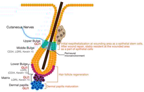 GLI1-expressing hair follicle stem cells and their roles. The expression of GLI1 and other markers define molecularly distinct zones in the telogen hair follicle, including regionalization of the bulge into the upper, middle, and lower bulge. GLI1-expressing cells in the upper bulge receive a HH signal from hair follicle-associated nerve cells, and are functionally distinct from cells in the middle bulge, lower bulge, and matrix in their ability to become epidermal stem cells during wound repair. The roles of each GLI1+ bulge stem cell population are described in orange text on the right.