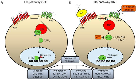 Schematic illustration of Hh signaling and how pathogens may modify pathway activity. (A) In the absence of Hh ligand, the receptor Ptch inhibits Smo activation. Ci/Gli is retained in the cytoplasm tethered to microtubules (in flies) or primary cilia (in mammals) through a complex of several proteins, simplistically termed here as “transcription factor inhibitory complex” (TFIC). This complex promotes Ci/Gli phosphorylation, which results in partial proteolysis to a repressor form that can readily enter the nucleus and repress expression of some Gli targets. (B) When Hh ligand binds to Ptch, inhibition upon Smo is relieved and the C-terminus of Smo is phosphorylated which promotes the release of Ci/Gli from the TFIC. The activated form of Gli/Ci can enter the nucleus and activate expression of Hh targets. Examples of canonical Gli target genes as well as those involved specifically in proliferation, immunity, and migration are given. Helicobacter Pylori (H.p.) has been proposed to act, in part, by repressing expression of the Hh ligand. Influenza NS1 and HBV X protein have been proposed to interact directly with Gli/Ci, but the precise mechanism by which they affect transcriptional activity has not been fully elucidated. The diagram also shows the pathway components which can be inhibited by FDA-approved small molecules: Vidmodegib and Sonidegib inhibit the activity of Smo, whereas arsenic trioxide (ATO) inhibits the activity of Gli1/2.