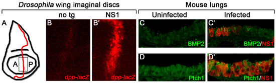In larval wing precursors (Figure 2A) expressing the influenza gene Nonstructural protein 1 (NS1), we detected a dramatic increase in expression of the Hh target gene, decapentaplegic (dpp) (Figure 2B), as well as the Dpp target, pMad, and a corresponding increase in distance between the adult wing veins L3 and L4, phenotypes indicative of increased Hh signaling [55,61,62]. Expression of BMP2, the mammalian homologue of dpp, and the Hh target, Ptch1, was also enhanced cell-autonomously in infected mouse lungs, indicating that the effect of NS1 on Hh signaling is conserved between species (Figure 2C,D) [55]. As NS1 is one of 14 proteins encoded by the influenza A virus whose main role is as a virulence factor to interact with host proteins to promote viral growth and maturation, it is perhaps expected that this protein may have evolved to exploit a conserved signaling pathway [63,64,65].