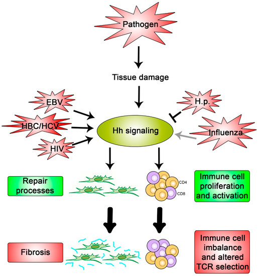 Hypothesis for what occurs during a pathogenic interaction with Hh signaling. Pathogens that cause damage to the host tissue promote activation of Hh signaling due to the key roles it plays in repair processes and immunity (green boxes). If not regulated properly, these cellular processes can cause fibrosis and an imbalanced immune response, respectively (red boxes). Pathogens, such as Influenza, EBV, HBC, HCV, HIV, and H.p., have been shown to directly modulate pathway activity once signaling is activated and may do so in order to exacerbate or restrain these detrimental outcomes.