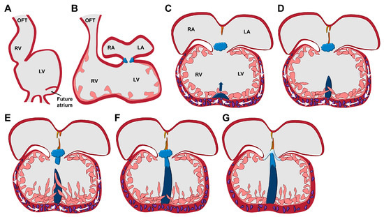 100 years ago, David Waterston reported that the ventricular septum (VS) grows out from the anterior bulboventricular groove [1]. In 1940, John Ernest Frazer identified the atrioventricular endocardial cushion cells as the original source of VS formation [2], causing a controversial debate about the place of origin from which the ventricular septum is formed. In the 1970s, investigations on congenital heart diseases revealed that the ventricular septum consists of different structures that are built up from different starting points [3,4,5,6]. The formation of the muscular part of the ventricular septum starts concomitantly with the ballooning of the linear heart tube [7]. During this ballooning, the heart chambers are specified and the bulboventricular groove develops [8] (Figure 1A–C). From the bulboventricular groove, the muscular ventricular septum arises (Figure 1C–E), while the membranous part of the ventricular septum is formed by the atrioventricular endocardial cushion cells [9] (Figure 1E,F). The development of the muscular ventricular septum is based on the proliferation of cells that are localized in the ventricular walls and takes place concomitantly with the growth of the both ventricles [10,11] (Figure 1C–E). Moreover, many of the trabeculae (intraventricular collections of linearly ordered myocytes) fuse with the growing muscular ventricular septum and accelerate its outgrowth (Figure 1D,E) [12,13]. Since the trabeculae are derived from the myocardial cells of the ventricular walls [14,15,16], the proliferation of the ventricular wall cells is of outstanding importance for the formation of the muscular ventricular septum [10,17,18]. Finally, the muscular VS comprises a mixture of cardiomyocytes derived from the left and the right ventricle [11]. The muscular VS, after its formation, interacts with the atrioventricular endocardial cushion cells in a yet unknown manner, thereby initiating the development of the membranous VS [9,19,20]. The membranous VS grows from the atrioventricular endocardial cushion cells towards the muscular VS until they finally fuse together [19,21,22] (Figure 1E–G).