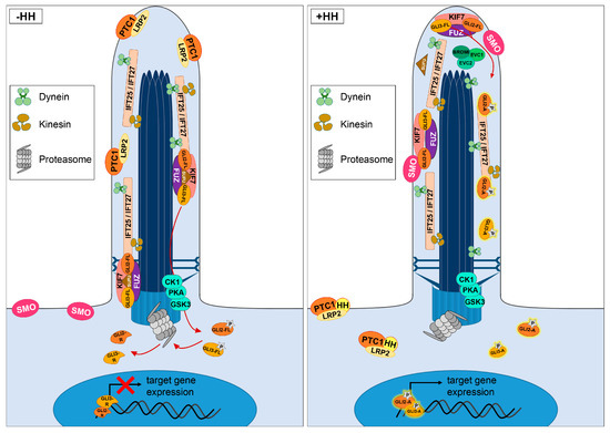 In vertebrates, HH signalling is mediated by primary cilia. The transport of proteins through the cilium is performed by the motor proteins Kinesin and Dynein, as well as by IFT proteins, in the case of HH signalling components especially by IFT25 and IFT27. In the absence of the HH ligand, PTC1 prevents the ciliary entry of SMO. GLI2-FL and GLI3-FL are bound to SUFU and get phosphorylated by PKA, CK1, and GSK3-β. Subsequently, GLI2-FL and GLI3-FL undergo proteolytic processing, which is realised by the cilia-regulated proteasome. Moreover, KIF7 and FUZ were reported to be involved in the proteolytic processing of these proteins. The products of this processing event, GLI2-R and GLI3-R, translocate into the nucleus to inhibit HH target gene expression. In the presence of HH, the ligand binds to PTC1. This binding is supported by the co-receptor LRP2. After this binding event, the PTC1/LRP2/HH complex exits the cilium allowing SMO to enter the cilium. Within the cilium, SMO induces the dissociation of the GLI2-FL and GLI3-FL proteins from SUFU. With the support of BROMI, EVC1, and EVC2, SMO modifies GLI2-FL and GLI3-FL into the transcriptional activators GLI2-A and GLI3-A (most likely by phosphorylation). After this modification, GLI2-A and GLI3-A activate HH target gene expression.