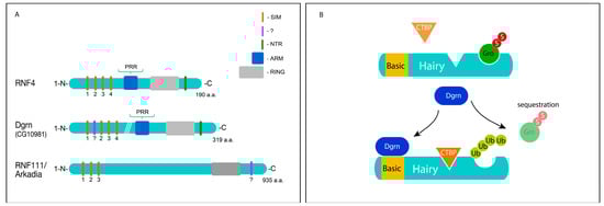 - Abed, M.; Barry, K.C.; Kenyagin, D.; Koltun, B.; Phippen, T.M.; Delrow, J.J.; Parkhurst, S.M.; Orian, A. Degringolade, a SUMO-targeted ubiquitin ligase, inhibits Hairy/Groucho-mediated repression. EMBO J. 2011. [Google Scholar] [CrossRef] [PubMed]