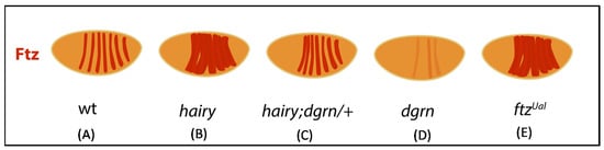 - Ingham, P.W.; Pinchin, S.M.; Howard, K.R.; Ish-Horowicz, D. Genetic analysis of the hairy locus in Drosophila melanogaster. Genetics 1985, 111, 463–486. [Google Scholar] [PubMed]
