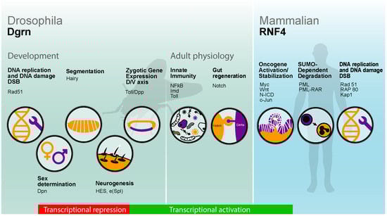 Processes and key proteins regulated by Dgrn and RNF4 in Drosophila and humans. In the developing embryo, Dgrn is required to resolve DSBs, and a similar function was attributed to RNF4 upon DNA damage in mouse and humans. In transcription, Dgrn determines co-factor choice during transcriptional repression limiting Hairy, Deadpan (Dpn), and HES E(spl) activity during segmentation, sex determination, and neurogenesis. Dgrn and RNF4 also enhance transcriptional activation. Dgrn is required for the expression of early zygotic genes such as twist, and zen downstream targets of the Toll and Dpp pathways. In the adult fly, Dgrn is required for the transcription of AMP genes, and for Notch-dependent transcription and gut regeneration. Likewise, RNF4 stabilizes and potentiates the transcriptional activity of c-Myc, c-Jun, and β-catenin promoting tumorigenesis of cancer cells. In contrast, in the context of promyelocytic leukemia, RNF4 ubiquitinates and targets the SUMOylated oncogenic PML-RAR for degradation, which suppresses tumorigenesis.