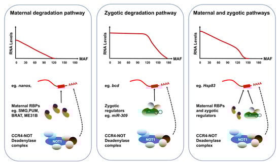 The transcriptomic landscape is highly dynamic during the cleavage cycles, as several RNA degradation pathways operate to selectively remove large sets of deposited transcripts. Indeed, a study using chromosomal deletions to track the post-transcriptional dynamics of maternal and zygotic transcripts has shown that approximately 35% of maternally-deposited mRNAs are cleared out by the MBT []. Comparisons of degradation dynamics in unfertilized and fertilized embryos have revealed the prevalence of at least two pathways. The early onset maternal pathway operates independently of ZGA and accounts for the destabilization of approximately 20% of all mRNAs [] (Figure 2). This maternal degradation program reflects the coordinated activity of RNA-binding proteins (RBPs) that associate with specific subsets of maternal transcripts and recruit the CCR4-NOT deadenylase complex to initiate their degradation []. Maternal clearance is a highly-coordinated process determined by the interplay of cis-acting motifs, generally found in the 3′UTR of the target transcripts, and RBPs that adopt tightly regulated spatial and temporal distributions. Indeed, mRNAs encoding the RBP Smaug (SMG) form an anterior-to-posterior gradient in the oocyte and are translationally regulated at egg activation []. SMG activity peaks at NC10, enacting an elegant spatial and temporal regulation of maternal clearance [,,]. In addition, three RBPs, Pumilio (PUM), Brain tumor (BRAT) and ME31B have more recently been shown to have non-overlapping roles in mediating the decay of hundreds of maternal transcripts [,].