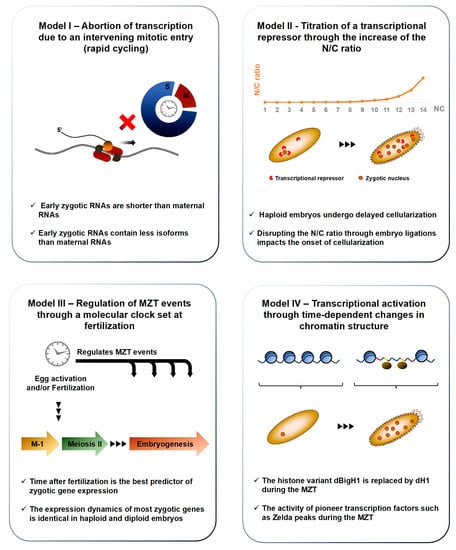 As maternal clearance takes place during the cleavage cycles, the transcriptomic landscape is remodeled and new populations of transcripts arise upon activation of the zygotic genome. The mechanisms behind ZGA onset are poorly understood and remain an outstanding question in developmental biology, although several models have been proposed [] (Figure 4). Seminal work involving the injection of plasmids in Xenopus embryos showed that early transcription is possible prior to ZGA [,]. However, the expression of plasmid DNA is rapidly silenced and resumes at the normal timing of transcription initiation. This observation suggests that the early zygotic genome is transcriptionally competent and actively repressed during the cleavage cycles. Moreover, ZGA is a gradual process and delineating its onset has remained challenging. Indeed, the emergence of the first zygotic transcripts has long been associated with the acquisition of the syncytial blastoderm morphology, at NC8. However, the detection of a small subset of zygotic genes before NC7, including the transcription factor engrailed (en), has recently been reported in preblastoderm embryos, with key implications in establishing the synchrony of early mitotic cycles []. Regardless of the exact onset of their expression, the first zygotic products display a conserved tendency to encode few exons and their length is shorter than maternally provided mRNAs []. In line with this observation, one hypothesis is that transcription is systematically attempted during the first cleavage cycles but that nascent transcripts are largely aborted, due to excessively fast cycling [,,,,,]. Hence, zygotic genes may be shorter than populations contributed maternally because Pol II can complete their transcription prior to an intervening mitotic entry [,].