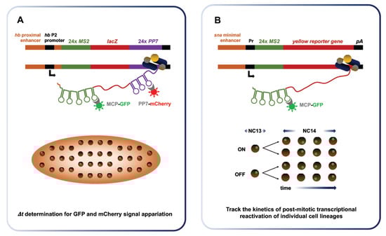 While zygotic transcription drives key events of embryonic development, the properties and dynamics of the emerging transcriptional process itself have been challenging to study. The advent of approaches enabling RNA labeling in vivo and in real time has provided a clearer picture of zygotic transcription. Originally developed by Singer and colleagues in yeast, the MS2 system takes advantage of the strong affinity of bacteriophage coat proteins (e.g., MS2, PP7) for specific RNA stem-loops []. For imaging purposes, MS2 phage coat protein fused to a fluorescent reporter (e.g., GFP, mCherry) are co-expressed in a transgenic organism along with an RNA fusion that encompasses the target transcript and MS2 stem-loop repeats (Figure 7). Stable tethering of the coat fusion protein allows for durable tracking of the target RNA, which can be expressed in its endogenous regulatory context to recapitulate physiological properties []. Over the last decade, several groups have harnessed the power of the MS2 imaging system to study RNA dynamics and localization during Drosophila development [,,,,,] This system has notably been used to investigate the dynamics of transcriptional bursting, calculate Pol II elongation rate at the MBT and monitor post-mitotic transcriptional reactivation.