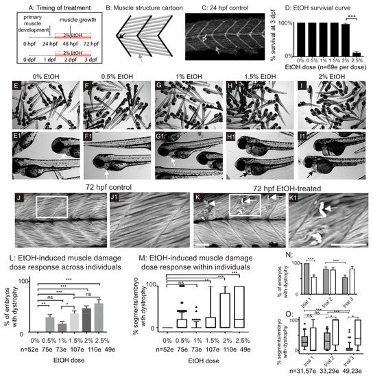 Zebrafish primary muscle development entails the elongation of short muscle precursor cells into long myofibers that attach to the ECM at the MTJ and undergo fusion to generate myotubes [33]. This process occurs by 24 post fertilization (hpf) (Figure 1A–C). Exposure to 2 or 2.5% EtOH during primary muscle development (8–24 hpf) results in smaller muscle fibers and abnormally wide MTJs [8]. We asked if muscle integrity would be disrupted in zebrafish that were treated with EtOH after primary muscle development during a period of muscle growth (Figure 1A). We first assessed survival and found that treatment with 0–2% EtOH did not drastically affect survival at 72 hpf (Figure 1D). In contrast, most zebrafish treated with 2.5% EtOH died by 72 hpf (Figure 1D). Exposure to lower concentrations of EtOH (0.5–1%) did not cause gross morphological phenotypes (Figure 1E–G1). Exposure to 1.5% EtOH or higher resulted in fully penetrant pericardial edema (Figure 1H–I1 n = 52/52 and 53/53 for 1.5 and 2% EtOH, respectively). EtOH exposure also caused muscle damage. Control zebrafish had linear, organized muscle fibers at 24 hpf (Figure 1C, white arrow) and at 3 dpf (Figure 1J–J1). EtOH treatment caused muscle fiber degeneration (Figure 1K–K1, white arrows) although there was not a clear dose-dependent effect (Figure S1L,M, supplementary materials). These data suggest that EtOH negatively affects skeletal muscle homeostasis in zebrafish.