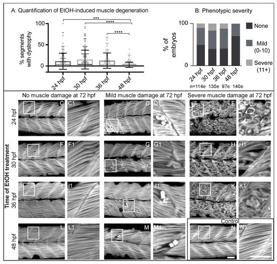 Zebrafish primary muscle development is followed by a period of growth [34,35]. Less obvious, but significant changes also occur in the ECM at the MTJ during this time (reviewed in [36]). Thus, we asked whether there were any critical time windows in which EtOH administration would result in increased muscle damage. We treated embryos continuously with 2% EtOH beginning at 24, 30, 36, or 48 hpf and fixed them at 3 dpf. We found a spectrum of muscle damage severity following EtOH administration at each time point. However, muscle phenotypes were significantly less severe when zebrafish were EtOH-treated at 48 hpf (Figure 2A). To better analyze the muscle damage spectrum, we binned fiber detachment phenotypes into one of three groups: none (0 muscle segments with fiber detachments), mild (1–10 segments with fiber detachments), or severe (11+ segments with fiber detachments). Zebrafish treated with EtOH beginning at 24, 30, or 36 hpf displayed the full spectrum of muscle damage severity (Figure 2B–K1). In contrast, treatment at 48 hpf resulted in either no or only mild muscle damage (Figure 2B,L–M1). These data indicate that zebrafish are more refractory to EtOH-induced muscle damage later in development.