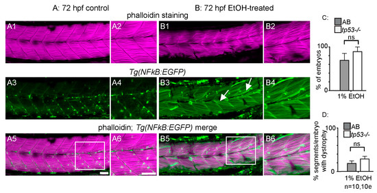 NF-kB-dependent inflammation is present, but p53-dependent apoptosis is not required for EtOH-induced fiber detachments. (A1–B6) Anterior left, dorsal top, side-mounted 72 hpf Tg(NF-kB:EGFP) embryos stained with phalloidin (pseudo-colored fuchsia) to visualize actin. (A1–6) 72 hpf Tg(NF-kB:EGFP) control embryo. (A1–2) Phalloidin channel only. (A2) Zoomed-in view corresponds to white box in A5. (A3–4) GFP channel only. (A4) Zoomed-in panel corresponds to white box in A5. Note low NF-kB activity in muscle fibers. (A5) Phalloidin and NF-kB-EGFP channels merged. (A6) Zoomed-in panel corresponds to white box in A5. (B1–6) 72 hpf Tg(NF-kB:EGFP) embryo treated continuously with 2% EtOH from 30 to 72 hpf. (B1–2) Phalloidin channel only. (B2) Zoomed-in view corresponds to white box in B5. (B3–4) GFP channel only. (B4) Zoomed-in view corresponds to white box in B5. Note increased NF-kB activity in muscle fibers due to EtOH exposure. White arrows points to muscle fibers expressing GFP. (B5–6) Phalloidin and NF-kB-EGFP channels merged. (B6) Zoomed-in view corresponds to white box in B5. (C–D) Quantification of fiber detachment frequency within and between AB or tp53 mutant embryos treated with EtOH from 30 to 72 hpf. (C) Percent of EtOH-treated embryos displaying one or more fiber detachments. There was no significant difference in fiber detachment frequency between embryos depending on AB (gray bars) vs. tp53 mutant (white bars) genetic background at 1% EtOH. (D) Percent of imaged segments with fiber detachments per embryo. There was no significant difference in fiber detachment frequency within embryos depending on AB (gray bars) vs. tp53 mutant (white bars) genetic background at 1% EtOH. Scale bars are 50 micrometers. “e” = embryo. Error bars are standard error of the mean.