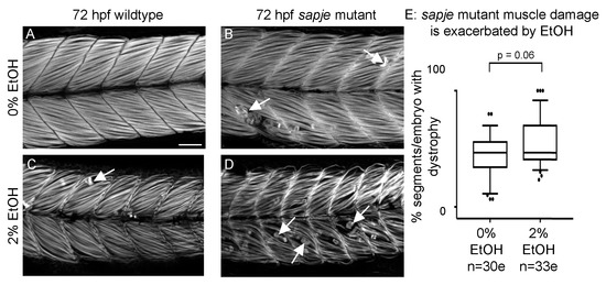 Given the differences between sapje mutant and EtOH-treated zebrafish, we asked whether EtOH treatment would additively worsen muscle damage in sapje mutant zebrafish. Wildtype zebrafish not exposed to EtOH displayed normal muscle (Figure 6A). sapje mutants not exposed to EtOH or wildtype embryos exposed to 2% EtOH had relatively few foci of muscle damage (Figure 6B–C, white arrows). sapje mutants treated with 2% EtOH displayed more segments with muscle damage per embryo than either unexposed sapje mutants or exposed wildtypes alone (Figure 6D, white arrows). Although EtOH-treated sapje mutant zebrafish trended towards having more muscle degeneration, the interaction was not quite significant (Figure 6E, p = 0.06).