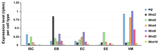 The Drosophila genome encodes seven Wnt genes [115]. In addition to Wg, the other six Wnts (Wnt2, Wnt4, Wnt5, Wnt6, Wnt10, and WntD) are also expressed in the Drosophila intestine (FlyGut-seq [98]; Figure 2). Their precise expression pattern and contribution to the intestinal physiology awaits further work.