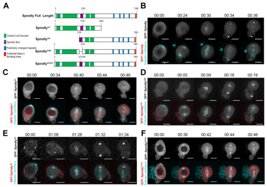 Spindly localises dynamically in dividing cultured cells [9,27,30]. During prophase and metaphase, Spindly associates with the kinetochore and moves poleward in early anaphase. While details of the requirement of Spindly protein domains for its localisation are available for the human homologue [30], this information is still missing for Drosophila Spindly. Therefore, to perform a domain-function analysis, we generated a similar range of GFP-tagged Spindly protein constructs, as studied by Barisic et al. [30] and expressed them in larval neuroblasts, using the Gal4/UAS system [37] (Figure 1A). Larval neuroblasts (NBs) are rather large cells, which can be cultured in vitro and are readily identified and imaged during mitosis at high spatial resolution [38]. For these reasons, larval NBs provide an excellent model to study the dynamic localisation of proteins during mitosis. Overexpression of GFP::Spindly in neuroblasts revealed that the protein localises to the kinetochores in a dynamic fashion during mitosis (Figuer 1B, Supplementary Materials Movie 1). A construct that lacks the C-terminal 380 amino acids did not localise to kinetochores during neuroblast division, suggesting that, like in humans and C. elegans, the C-terminal half is essential for normal Spindly localisation to kinetochores (Figure 1C; Supplementary Materials Movie 2). All the other constructs localised to the kinetochores during mitosis (Figure 1D–F; Supplementary Materials Movies 3–5). Another interesting observation was that in 78% of cases (n = 40), the protein lacking the N-terminal 228 amino acids localised to cytoplasmic punctae in interphase, which were never observed with any of the other constructs (Figure 1E; Supplementary Materials Movie 4). The speckles do not seem to be polarised in any way. With the caveat that overexpression of GFP-conjugated fusion proteins may cause the abnormal localisation of proteins in a wild type background, our results suggest that the N-terminal domain is required for the normal distribution of the protein in interphase. Furthermore, our experiments confirm that similar to human Spindly, the C-terminal domain is important for binding to the kinetochore.