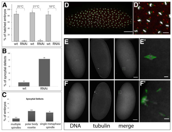 Phenotype of mat-tub>>Gal4 driven Spindly knock-down. (A) Larval hatching rates of spindly[mat67>>RNAi] embryos at temperatures indicated (n = 100); for protein levels see Supplementary Materials Figure S1; (B) Penetrance of mitotic arrest during syncytial divisions in spindly mat67>>RNAi embryos (n = 100). (C) Expressivity of syncytial cleavage defects in spindly mat67>>RNAi embryos (n = 30); (D,D’) Mitotic domains in wild-type syncytial blastoderm embryo. Nuclei are stained with DAPI (grey), anti-beta-tubulin (green) and anti-Centrosomin (red). Scale bars represent 50 µm (D) and 10 µm (D’); (E,F) Syncytial division defects in spindly mat67>>RNAi embryos. The images are maximum-intensity projections of 10 μm z-stack (at spacing of 1 μm); (E,E’) Embryos often contained a single metaphase-arrested nucleus; (F,F’) In some cases condensed polar body rosettes were visible. (DAPI (grey) and beta-tubulin (green). Scale bars: 50 μm (E,F) and 5 μm (E’,F’).