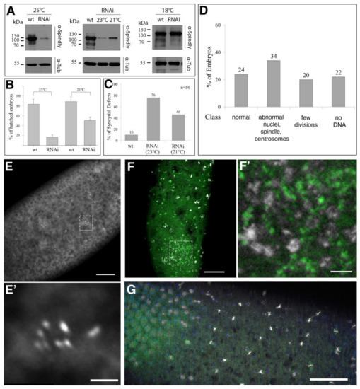 Phenotype of nos>>Gal4 driven Spindly knock-down. (A) Immunoblot analysis of protein lysates of 0–3 h old w1118 embryos (wt) or spindly[nos>RNAi] (RNAi) embryos at different temperatures (loading control—α-Tubulin (Tub); molecular weight standards in kDa); (B) Viability of spindly[nos>RNAi] scored by larval hatching rate (n = 100; data represent 3 independent replicates); (C) Penetrance of mitotic arrests in syncytial divisions of spindly[nos>RNAi] embryos featuring phenotypes described in (D–G); (D) Expressivity of syncytial cleavage defects of spindly[nos>RNAi] embryos at 23 °C. Occurrence of phenotypic classes of spindly[nos>RNAi] embryos (n = 50); (E) Syncytial stages with patches of multiple centrosomes (anti-Centrosomin staining); (E’) higher magnification of boxed area in (E); scale bars: 50 µm (E) and 10 µm (E’)); (F) Condensed chromatin associated with patches of tubulin (detail indicated by yellow box; DAPI (grey), beta-tubulin (green), scale bars represent 50 µm (F) and 10 µm (F’)); (G) Asynchrony of mitotic divisions, as indicated by an area of mitotic divisions and areas enriched in interphase nuclei (scale bar: 50 µm).