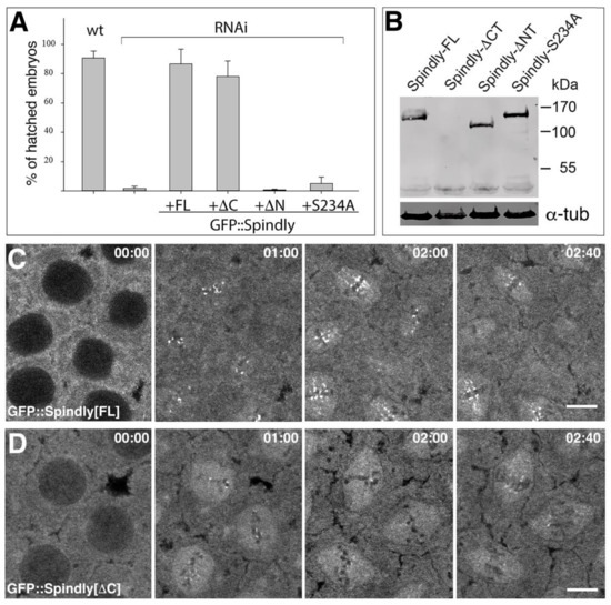 The loss-of-function studies reported here demonstrated that maternally supplied Spindly is essential for sustaining the syncytial cell cycles in the embryo. Importantly, the phenotypes were specific for Spindly RNAi knockdown, as a full rescue of the defects was observed by the expression of an RNAi-resistant Spindly protein. In the course of these experiments, we noted that the expression of GFP::Spindly using the maternal alpha-tubulin67c>Gal4, in a wild-type background that is caused defects in embryogenesis. In mat67>>GFP::Spindly embryos, levels of Spindly-GFP were higher than endogenous protein levels in lysates from 0–3 h-old embryos at 25 °C (Figure 6A).