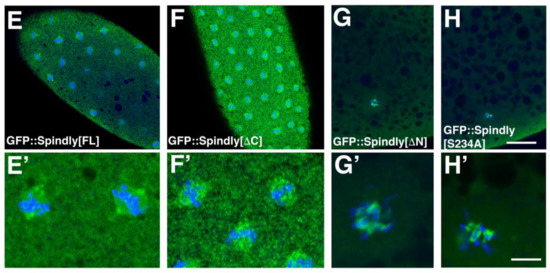 spindly[mat67>RNAi] had severe effects on embryogenesis causing a remarkable embryonic lethality (Figure 2A). The well-established function of Spindly for mitosis suggested that spindly[mat67>RNAi] should affect the syncytial mitotic divisions in the early embryo explaining the embryonic lethality upon its depletion (Figure 2A). Indeed, the immunostaining of mitotic spindles in early embryos revealed that 83% (n = 100) of the spindly[mat67>RNAi] embryos showed abnormal syncytial cleavage divisions (Figure 2B–F). The majority of embryos arrested during metaphase of the first 1–3 mitotic divisions (Figure 2C–F). In 40% of the embryos (n = 30), only a single metaphase-arrested mitotic spindle was detected within the egg (Figure 2E,E’), whereas only in 13% of the cases a variable number of two to four mitotic spindles were observed. We also detected in many cases (46.6%) characteristic polar body rosettes [40], suggesting that egg activation occurs and meiosis is able to resume in spindly[mat67>RNAi] embryos (Figure 2F,F’). We conclude that Spindly is essential for syncytial cleavage division to commence.
