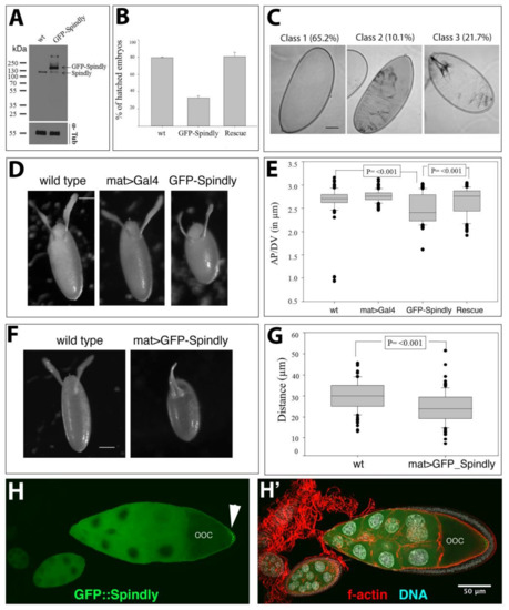 Spindly overexpression led to embryonic lethality, altered egg morphology and a mild ventralisation phenotype. Within the ovary, spherical egg chambers elongate dramatically until they acquire the typical ellipsoid shape of the mature egg. The contribution of the somatic follicular epithelium to the process has been well characterised. Egg elongation relies on the interaction between a polarised actin network in the follicle cells and a polarised arrangement of the basal membrane components [54,55,56]. Maternal effect mutations also often result in a round egg phenotype [57]. One of the best studied class is the so-called dumpless phenotype. This phenotype is caused by reduced cortical, radial, and/or ring canal associated actin bundles or defects in the ring canal morphogenesis required for the fast transport of maternal products from the nurse cells into the oocyte [58]. The slow transport of nurse cell products into the oocyte transport is Dynein-based [59] and mutations in the Dynein light intermediate chain also cause a round egg phenotype and ventralisation (Hüttinger and Müller, unpublished data). We therefore propose that Spindly overexpression might interfere with Dynein-based transport, resulting in altered egg morphology.
