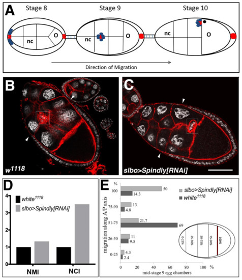 The border cells (BCs) in the Drosophila ovary provide an excellent model system to study genetic requirements of collective cell migration [44] The BCs form a cluster of 6–10 post-mitotic cells at the anterior domain of somatic follicular epithelium of the egg chamber around stage 8 of egg chamber development (Figure 7A). Subsequently, BCs undergo an epithelial-mesenchymal transition and migrate posteriorly as a coherent cluster, reaching the nurse cell-oocyte boundary by stage 10 of egg-chamber development (Figure 7A) [44]. Spindly expression was knocked down by driving shRNAi with the BC-specific slow border cells (slbo) Gal4 driver (slbo>Gal4) [45]. In wild-type egg chambers the majority of BC clusters had migrated halfway through the egg chamber at late stage 9 (69%, n = 42), while a small percentage (14.3%) had already completed their migration at this stage of egg-chamber development (Figure 7B,D,E). In ovaries from slbo>Spindly[RNAi] females, 50% (n = 46) of the BC clusters had completed migration at mid-stage 9 of oogenesis (Figure 7C–E). To compare the BC cluster migratory phenotypes upon Spindly-RNAi in a quantitative fashion, the normalised migration (MI) and the completion (CI) indices were calculated [46]. Values of both indices suggested that the down-regulation of Spindly protein level confers a migratory advantage to BC (Figure 7D). Thus, we concluded that knockdown of Spindly caused the BC cluster to migrate either earlier or faster along the anterior-posterior axis towards the oocyte, suggesting that Spindly negatively regulates border cell migration.