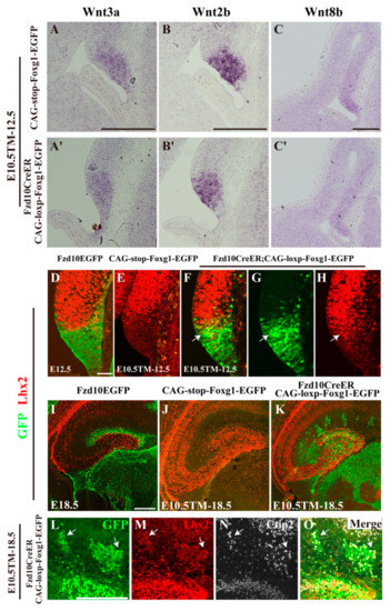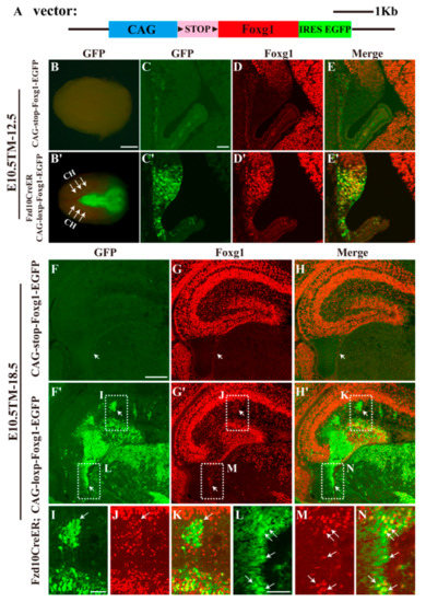 To elucidate the role of Foxg1 in the maintaining of the hem from E10.5 onwards, we first generated a transgenic mouse line in which full-length Foxg1 cDNA was driven by the CAG promoter. A Floxed stop codon and a reporter IRES-EGFP fragment were also introduced into the transgenic vector (Figure 1A). Previously, we have reported that one of the Wnts receptors, Frizzled10 (Fzd10), is specifically expressed in the hem [23] and generated transgenic mouse lines of Fzd10-TauLacZ and Fzd10-CreERTM using 5′ untranslated regions of the Fzd10 gene demonstrated that a large population of CR cells are derivatives of Fzd10-positive cells in the hem [23,24,25]. In this study, the overexpression of Foxg1 in the hem was achieved by crossing Fzd10CreERTM with the CAG-loxp-stop-loxp-Foxg1-IRES-EGFP line combined with tamoxifen induction. We first performed tamoxifen administration in Fzd10CreERTM;CAG-loxp-stop-loxp-Foxg1-IRES-EGFP at E10.5, the time window when the formation of the hem is almost completed. As shown in Figure 1B–C′, at E12.5, the reporter EGFP specifically labelled the hem and the dorsal thalamus where endogenous Fzd10 is expressed. Strong ectopic expression of Foxg1 in the hem was observed to be completely co-localized with EGFP (Figure 1C′–E′), indicating a successful forced expression of Foxg1.