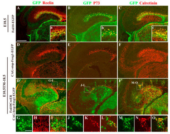 To further demonstrate the cell fate alteration caused by Foxg1 forced expression, immunostaining of anti-Calretinin, a calcium binding protein commonly used as a marker for CR cells and immature granule neurons [27,28,29], was employed. As shown in Figure 2C,F,F′,M–O, in both controls, Calretinin was expressed in immature granule neurons in the developing DG and CR cells located in the MZ (Figure 2C,F), while, in the Fzd10CreERTM;CAG-loxp-Foxg1-IRES-EGFP brain, besides immature granule neurons and CR cells, Calretinin was also found to be expressed in most GFP+ cells within clusters as well as these dispersed cells in the DG area (Figure 2F′,M–O). These Reelin−P73−GFP+Calretinin+ cells might represent a cell population of immature granule neurons.