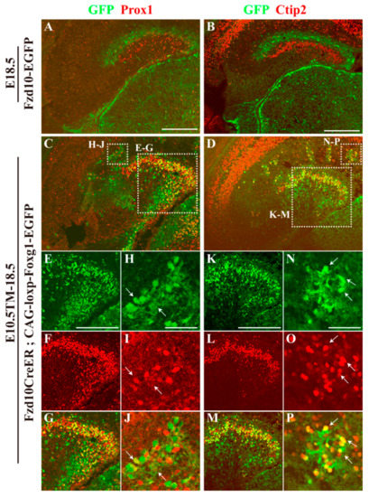 To further analyse the feature of the population of Reelin−P73−GFP+Calretinin+ cells, immunostaining of anti-Prox1 and Ctip2, two transcription factors that are critical for the development of granule neurons [30,31], was carried out. At E18.5, in the Fzd10-EGFP control, there was no co-localization of GFP with Prox1 or Ctip2, and Prox1+ and Ctip2+ granule neurons were located inside the DG MZ, forming the upper blade of the DG (Figure 3A,B). On the contrary, in the Fzd10CreERTM;CAG-loxp-Foxg1-IRES-EGFP brain, both Prox1 and Ctip2 were found to be expressed in clusters outside the DG (Figure 3C,D,H–J,N–P). Within the DG, many GFP+ cells co-expressed Prox1 and Ctip2 (Figure 3C–G,K–M), demonstrating these ectopically-distributed hem-derived cells transformed into granule neurons.