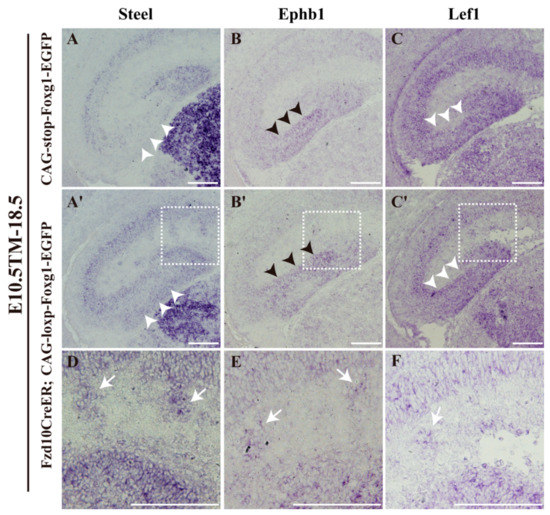 Steel and Ephb1 have been used to label developing granule cells in the DG [32,33,34]. To confirm the cell fate transformation, in situ hybridization of Steel and Ephb1 was performed on E18.5 brains after tamoxifen administration at E10.5. As shown in Figure 4A,B, in the control, strong staining for Steel was detected in the DG, and Ephb1 was strongly detected in migrating granule cells. In Foxg1 overexpressed transgenic brains, in the migration route increased staining of Steel was observed (Figure 4A,A′), and the staining of Ephb1 seemed a little thicker than that of the controls. Ectopic staining of Steel and Ephb1 was also detected in clusters outside the DG (Figure 4A′,B′,D,E). Since Lef1, a mediator in the Wnt signalling pathway, plays an important role during the development of the DG [7], we then examined its expression. Compared to the control, in Fzd10CreERTM;CAG-loxp-Foxg1-IRES-EGFP brain, similar to that of Steel and Ephb1, clusters also displayed ectopic strong staining for Lef1 (Figure 4C–C′,F). A little thicker staining of Lef1 in the migration route was also detected (Figure 4C,C′). Taken together, our data demonstrated hem-derived CR cells switched their fates into dentate granule neurons.