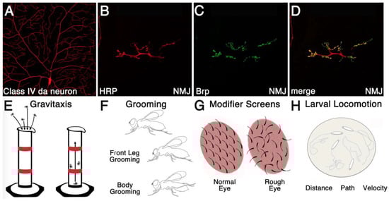 Phenotypic analyses to Assess RBP function within the nervous system. (A) Dendrite morphology can be easily assessed using live imaging of the highly complex dendritic trees of Class IV da neurons in larvae. In this image ppkGal4 drives the expression of UAStdtomato to label the da neuron; (B) Axon morphology of the larval NMJ can be visualized through the dissection of larvae and subsequent immunofluorescent detection of horse radish peroxidase (HRP) (B) and the active zone marker Bruchpilot (Brp) (C) (merge shown in D); (E) Behavior can be investigated using gravitaxis assays, which measure the amount of time it takes for adult flies to walk up to a certain height in a cylinder (the start and stop heights are marked by a red line), after being tapped to the bottom; (F) Grooming assays are also used to assess stereotypic repetitive behavior. Drosophila grooming behavior involves cleaning the body and wings with their legs, as well as cleaning legs with mouthparts; (G) The morphology of the Drosophila eye provides a quick readout for genetic interactions during modifier screens. Researchers look for enhancement or suppression of a rough eye phenotype that arises through disordered development of the ommatidia, which make up the compound fly eye (G); (H) In addition to adult locomotor behavior, larval locomotion can be easily assessed by tracing the path, distance, and speed that a larva travels on a petri dish over a certain period of time.